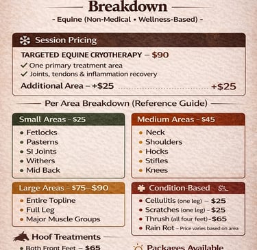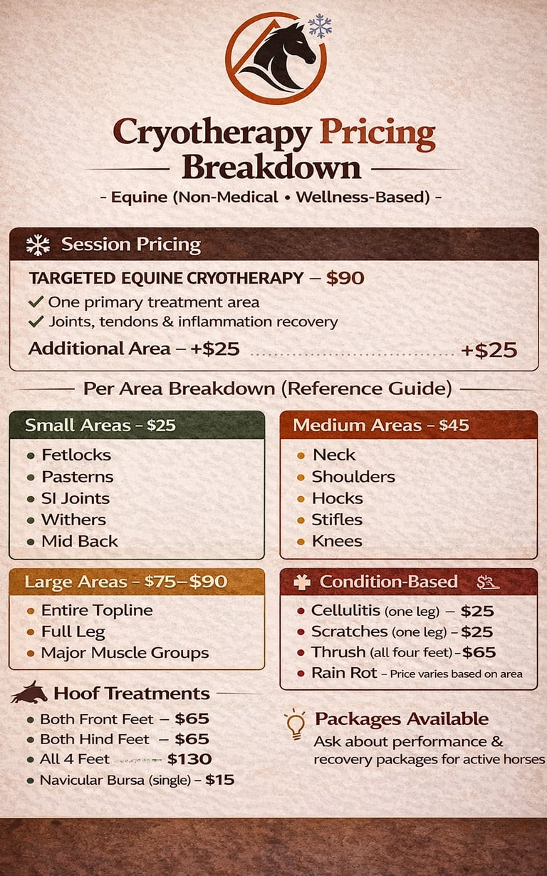 At Peak Wellness & Nutrition, we bring advanced equine cryotherapy and recovery services directly to your barn, arena, or event. Our targeted cold therapy is designed to support injury recovery, inflammation reduction, and peak performance for equine athletes of all levels.