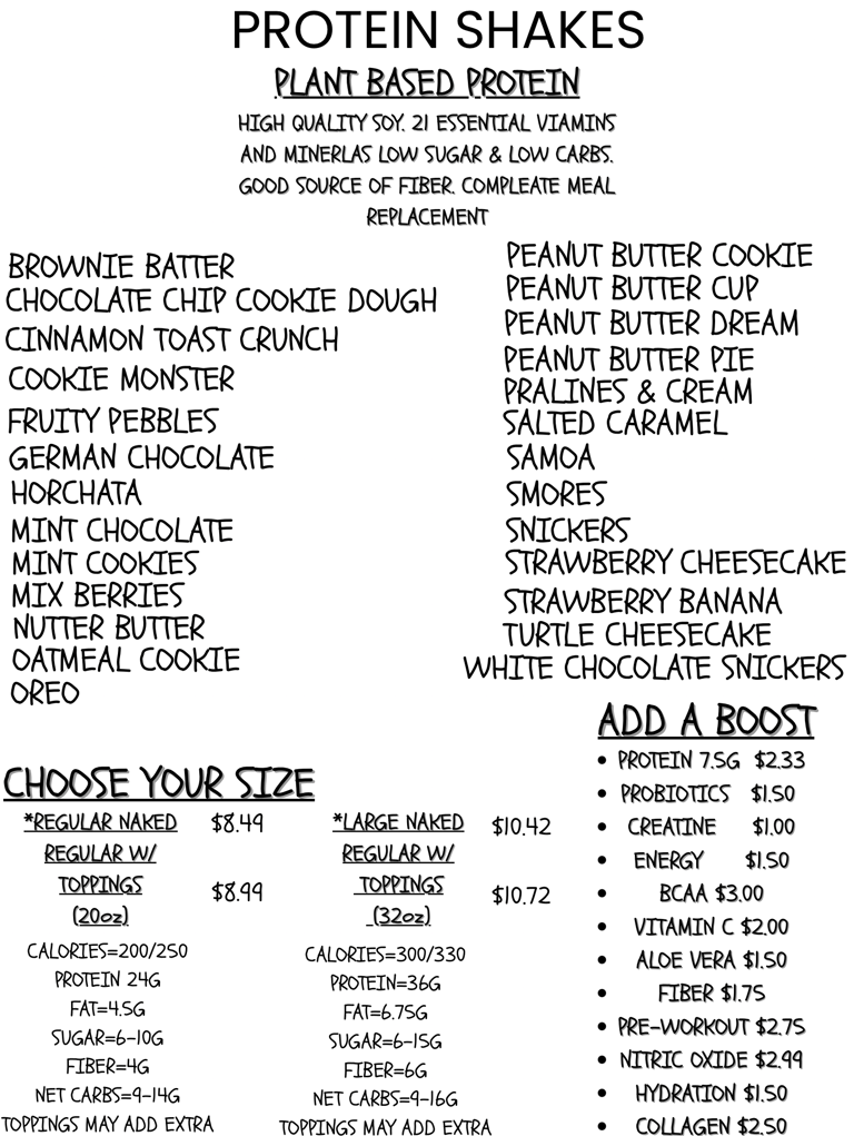Regular 24g plant based protein, 200-250calories Large 35g plant based protein, 300-350calories